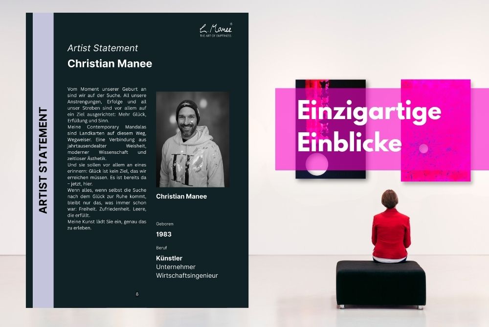 Tauchen Sie ein in eine Philosophie, die bereits Millionen Menschen zu mehr echtem Glück verholfen hat. Die zeitgenössischen Meisterwerke von Christian Manee leiten Dich von einzigartiger Ästhetik bis in einen Raum öffnender Leerheit und absoluter Freiheit.
